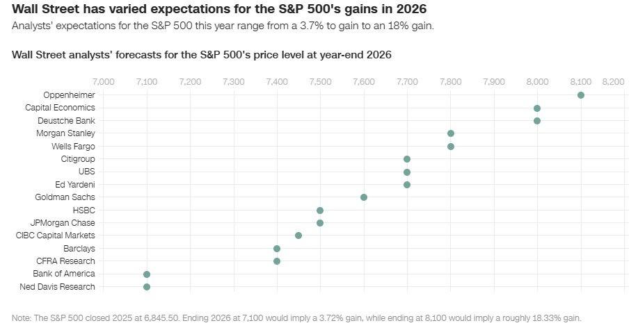 Estimates cluster between mid-single-digit and low-double-digit returns, with the S&P 500 expected to rise less than it did in 2025.