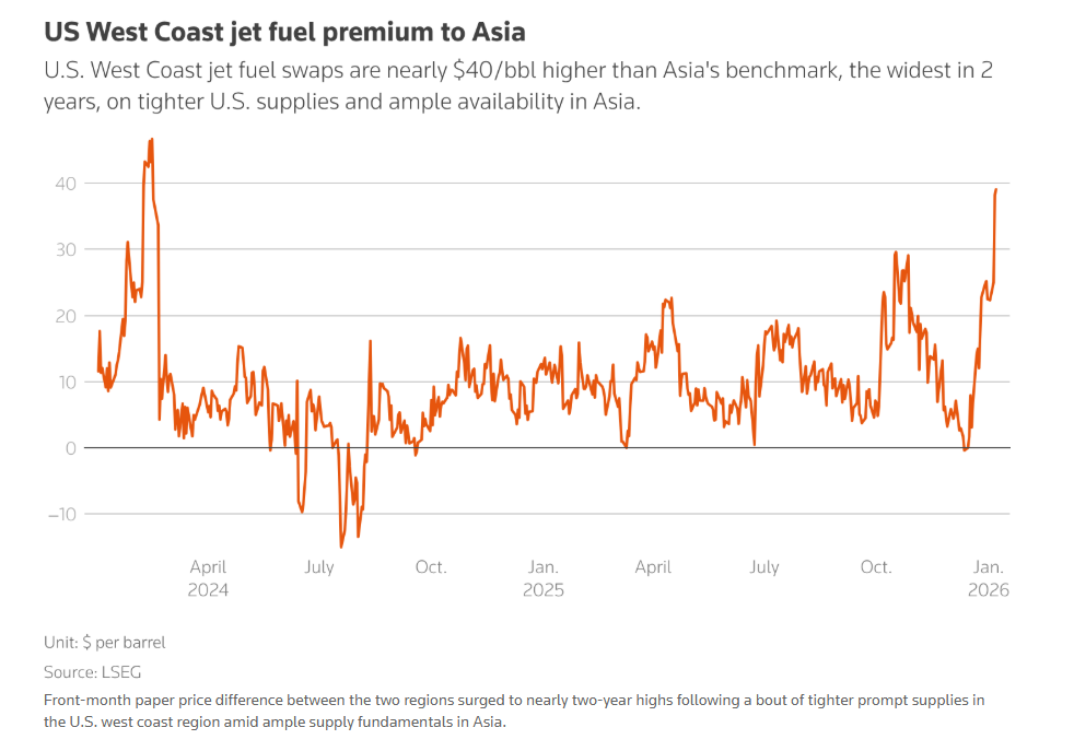 The price difference for jet fuel between Asia and the US West Coast has increased.