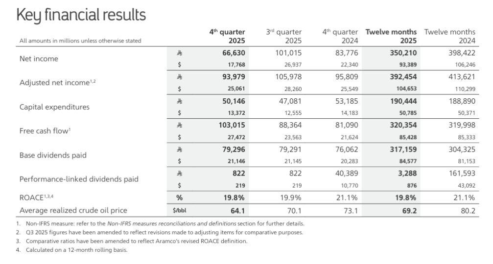 Aramco’s performance in 2025 reflected a decline, largely driven by weaker prices for crude oil, refined products, and chemicals.